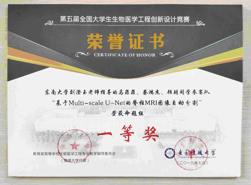 在刘澄玉老师的指导下,我们三位同学完成的人工智能类命题项目“基于Multi-scale U-Net的脊柱MRI图像自动分割”从众多队伍中脱颖而出,入围决赛。在决赛中,同学们从设计思路、模型建立过程、创新点、应用价值等对作品进行了多方位展示(海报、PPT答辩、现场程序演示测评等),得到了评委老师的一致认可,在所有人工智能命题组决赛答辩中分割指标高居前列,最终以优异成绩获得全国一等奖,并荣获中元生物创新技术奖。