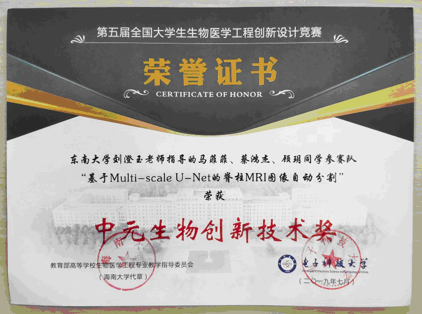 在刘澄玉老师的指导下,我们三位同学完成的人工智能类命题项目“基于Multi-scale U-Net的脊柱MRI图像自动分割”从众多队伍中脱颖而出,入围决赛。在决赛中,同学们从设计思路、模型建立过程、创新点、应用价值等对作品进行了多方位展示(海报、PPT答辩、现场程序演示测评等),得到了评委老师的一致认可,在所有人工智能命题组决赛答辩中分割指标高居前列,最终以优异成绩获得全国一等奖,并荣获中元生物创新技术奖。