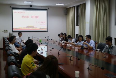 2020年9月21日下午,220171班新学期班会在四牌楼校区老图书馆举行,丁辉副校长作了题为“新形势·新征程”的主题党课。班主任张军老师主持班会,学院党委书记王军老师全程参加了党课及交流。