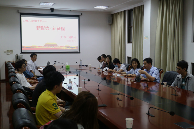 2020年9月21日下午,220171班新学期班会在四牌楼校区老图书馆举行,丁辉副校长作了题为“新形势·新征程”的主题党课。班主任张军老师主持班会,学院党委书记王军老师全程参加了党课及交流。