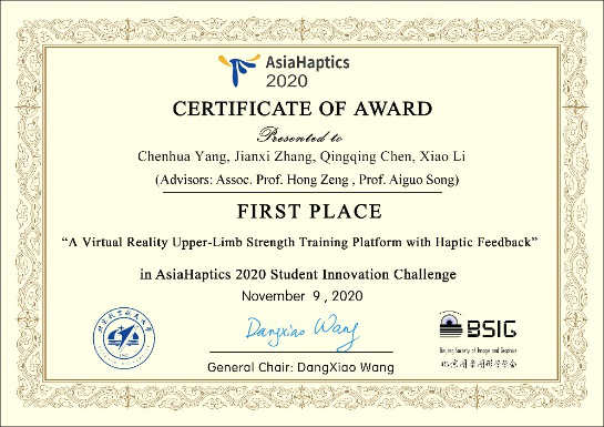 2020年11月9日由北京航空航天大学主办,北京图象图形学学会、北航虚拟现实技术与系统国家重点实验室协办的第四届亚洲触觉会议(AsiaHaptics2020)线上研讨会于晚上8:00-11:00成功召开。会上,宣布了此次亚洲触觉会议学生创新挑战赛获奖名单,历时8个多月,经过项目提案,开发报告及演示视频提交,组委会从参赛作品中最终评选出1个第一名和2个荣誉奖。由我们曾洪副教授和宋爱国教授共同指导的学生团队(杨晨华、张建喜、陈晴晴和李潇)作品“A Virtual Reality Upper-Limb Strength Training Platform with Haptic Feedback”从日本京都大学、吉林大学等国内外众多高校学生团队的优秀作品中脱颖而出,荣获本次挑战赛第一名。