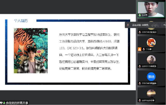 讲座第二部分由被纽约大学拟录取研究生的余翊旻分享国外申学经验。他的演讲分为申请背景、专业方向、选校择校、申请材料四个部分。余翊旻将申请资质分为成绩、经历两类,成绩包括本科成绩绩点、语言成绩,经历包括科研竞赛、实习经历等。成绩方面他着重分享了语言学习的经验,并提醒同学们申请学校的层次排名不同,语言成绩的要求也略有区别。经历方面,他提醒同学们多多关注学校官网以及微信公众号的相关资源。关于专业的选择,主要有EE(电子工程)、CE(计算机工程)、CS(计算机科学)三个方向。依照这三个方向,他分享了相关的院校并做较为详细的对比。最后,他就简历及推荐信的撰写分享了自己的经验,强调简历要主次分明、排版清晰,推荐信内容需客观真实。
