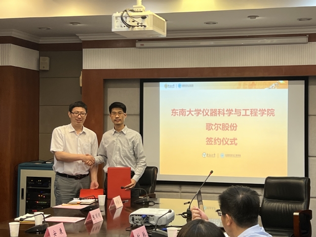 2022年5 月 23日,我们与歌尔股份有限公司合作签约仪式在四牌楼校区榴园宾馆举行。歌尔股份有限公司中央研究院院长张金国、副院长于洋、穿戴产品线技术委员会主任潘俊杰、学院副院长(主持工作)刘澄玉、副院长潘树国,校技术转移中心吴易飞等出席了仪式。仪式由学院党委书记王军书记主持。