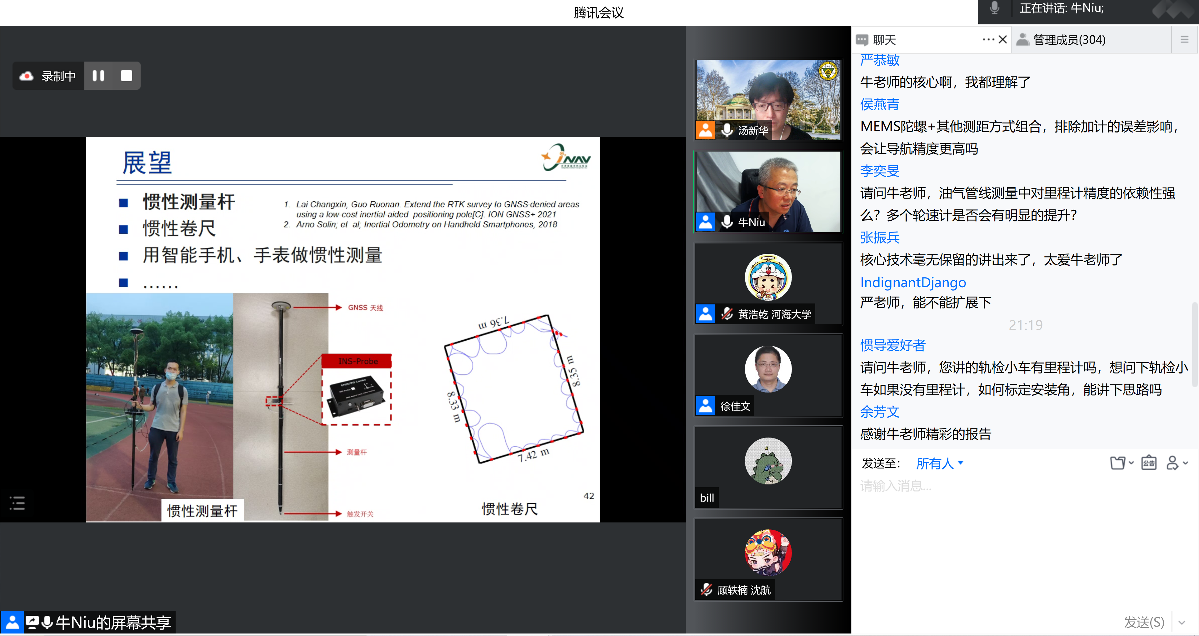 报告重点阐述了“惯性测量”概念的历史发展,惯性测量(Inertial Surveying)是将惯性传感器和惯性导航系统用于精密工程测量的一种尝试,始于上世纪70年代。报告以惯导轨检小车和惯导管线测量仪为例来阐述惯性测量的优势、挑战和关键技术,从中抽象出惯性测量的本质和技术边界,最后对其精度潜力和应用前景做展望。整个报告非常精彩,吸引近400参与人员,并在交互环节进行了深入的技术讨论,众多听众受益匪浅。