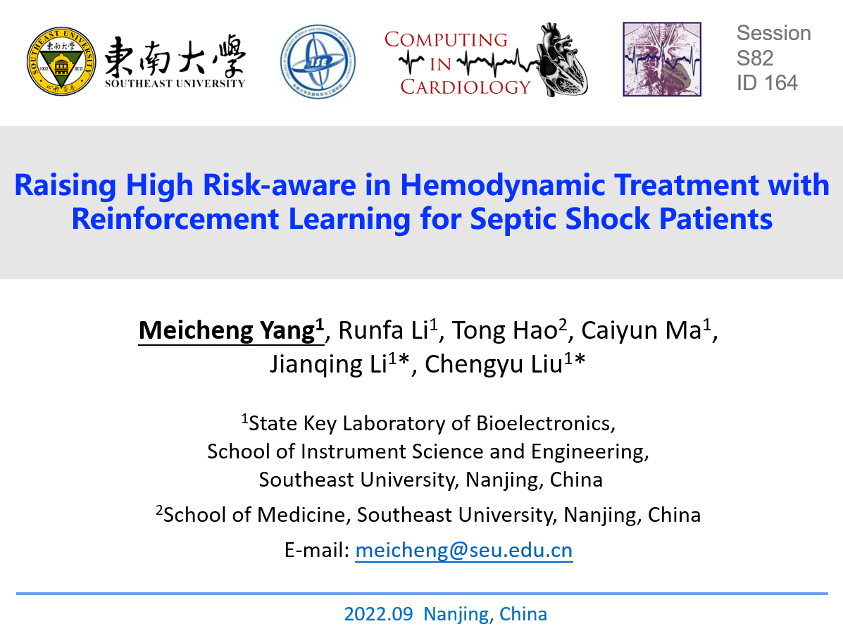 必威·BETWAY刘澄玉教授和课题组博士生董珂君、李洋、杨美程、王星尧、马彩云以及课题组硕士生李茜、沈毓敏代表必威BETWAY官网穿戴式智能监控实验室参加了本次会议。在心电图和睡眠障碍(ECG and Sleep Disorders)分会场,董珂君做了题为《Cardiopulmonary Analysis of Sleep Apnea Based on Weighted Limited Penetrable Horizontal Visibility Graph》的口头报告,该报告分析了睡眠期间心肺动力系统的相互作用并为随后的睡眠阶段区分提供了可解释的基础。在光电容积描记术(Photoplethysmography )分会场,李洋做了题为《Effect of Oxygen Concentration Reduction on PPG Waveform Characteristics》的口头报告,该报告揭示了低氧环境对脉搏波波形特征的影响,填补了该领域的空白,探索了一种更舒适和无创的方法来观察和评估低氧条件下人体外周血管阻力和其他生理指标变化的路子,为高海拔缺氧环境中工作人员的生命健康监测提供了参考。在医学信息学与技术(Medical Informatics and Technology)分会场,杨美程做了题为《Raising High Risk-aware in Hemodynamic Treatment with Reinforcement Learning for Septic Shock Patients》的口头报告,该研究旨在利用强化学习方法识别脓毒性休克患者给药过程中的高风险治疗策略,做到早期监护和预警。其余学生分别在不同分会场进行了学术海报展示。