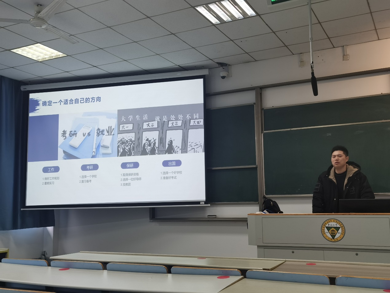 讲座中,曾欣结合自己大学期间的经历,从确定方向、升学认识、升学建议、职业生涯规划流程和找工作建议五个方面切入,给同学们细致讲述了大三的学业规划问题,向同学们强调了大三作为人生转择折的重要性。