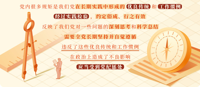 党内很多规矩是我们党在长期实践中形成的优良传统和工作惯例,经过实践检验,约定俗成、行之有效,反映了我们党对一些问题的深刻思考和科学总结,需要全党长期坚持并自觉遵循。这些规矩看着没有白纸黑字的规定,但都是一种传统、一种范式、一种要求。违反了这些优良传统和工作惯例,在政治上造成了不良影响,应当受到党纪惩处。