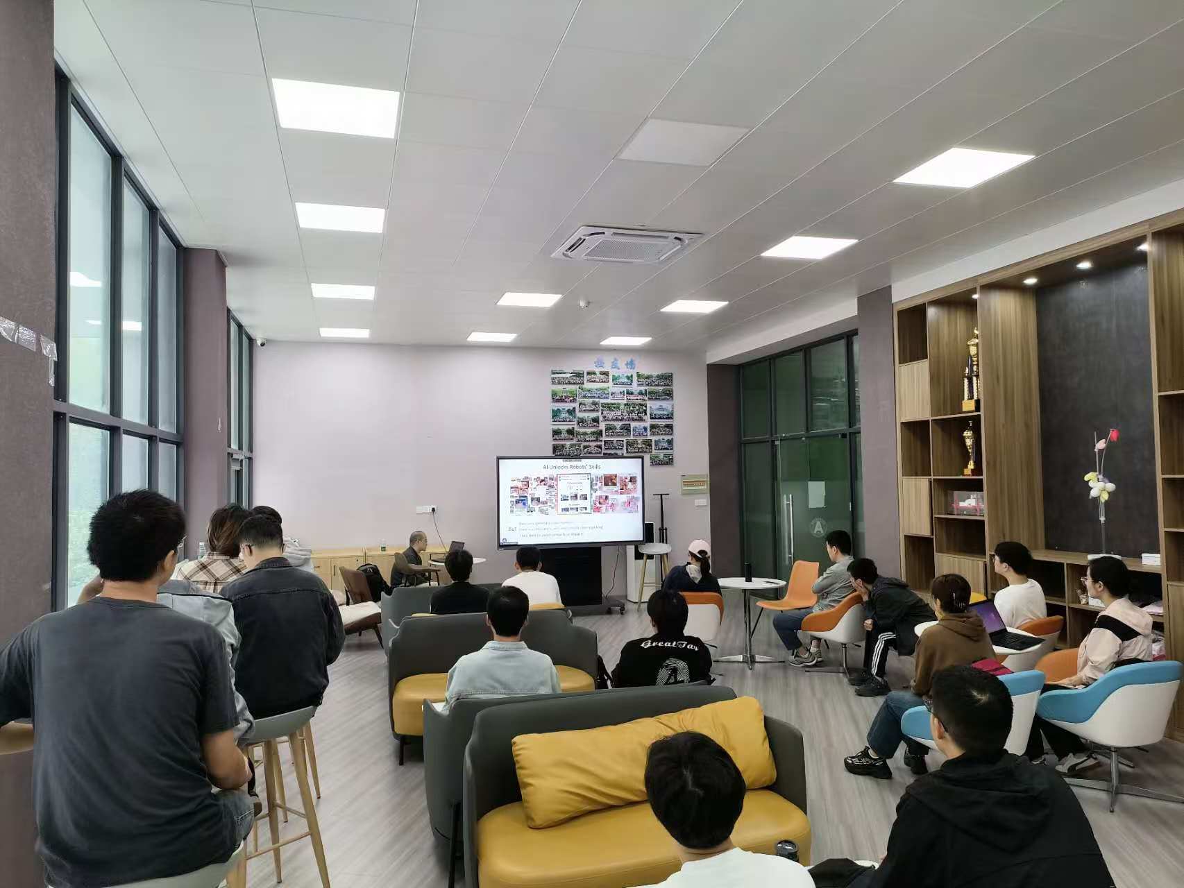 在机器人研究中,大多情况下会尽量避免机器人与物体、环境的接触和碰撞。在这次讲座中,潘教授首先介绍了课题组近期的工作,展示了如何利用主动接触实现动态操作,以及课题组在设计新型触觉传感器方面的进展。报告期间,潘教授还介绍了机器人学习领域的主流研究方向,并结合课题组在机器人柔性物体及布料操作、基于磁膜皮肤的超分辨率触觉传感器、以及通过有效接触实现大型物体操作等前沿研究成果,开阔了老师和同学们的视野。随后,潘教授课题组的徐航博士后做了题为《BiKC: Keypoint Conditioned Consistency for Bimanual Robotic Manipulation》的学术报告。