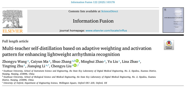 近日,必威·BETWAY刘澄玉教授、李建清教授团队在计算机科学领域中科院一区TOP期刊《Information Fusion》(IF: 15.5)发表了题为“Multi-teacher self-distillation based on adaptive weighting and activation pattern for enhancing lightweight arrhythmia recognition”的研究论文。该论文针对穿戴式心电设备通常算力受限难以部署复杂心律失常识别算法的问题,提出了一种基于多教师在线自我知识蒸馏的模型压缩算法,通过综合权衡多个教师模型“隐知识”引导的正确性与可接受性,在不引入额外教师模型的前提下实现高效的模型参数、计算量、能耗及推理速度优化,提升了穿戴式监测端侧模型的泛化鲁棒性。