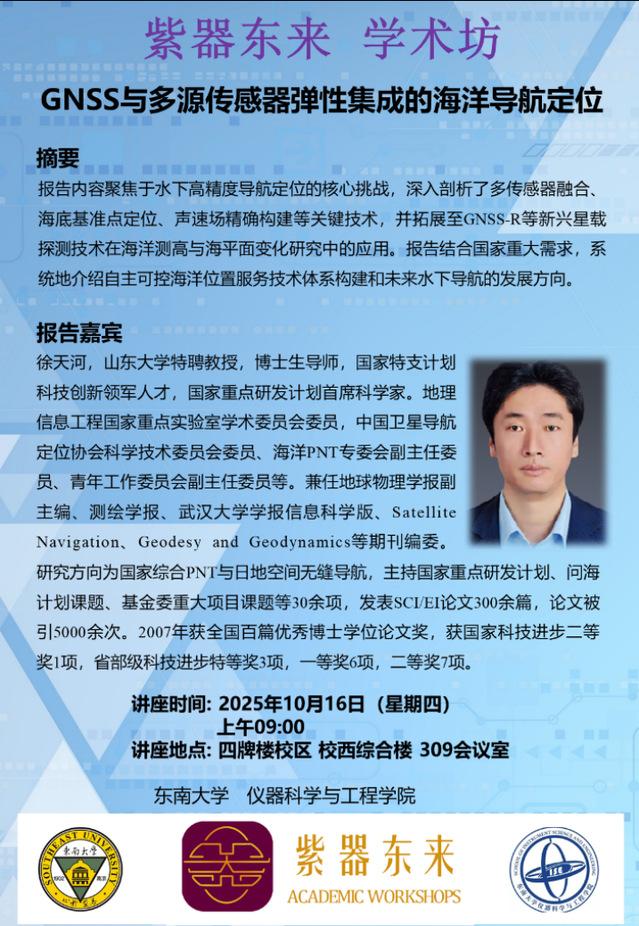 2025年10月16日,山东大学空间科学研究院特聘教授、国家特支计划科技创新领军人才徐天河教授应邀访问必威·BETWAY,并做了题为“GNSS与多源传感器弹性集成的海洋导航定位”的学术讲座。本次讲座吸引了学院众多师生踊跃参加,现场学术氛围热烈。